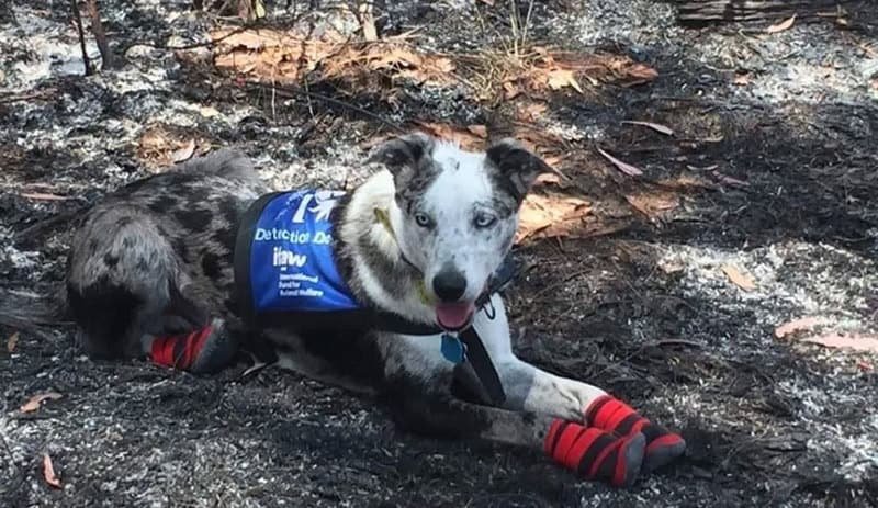 Apuntó que el pequeño canino generalmente busca animales enfermos o lesionados con fines de conservación e investigación en condiciones más tranquilas, estas últimas semanas ha estado utilizando protectores especiales en sus patitas para poder deambular por las zonas en peligro.