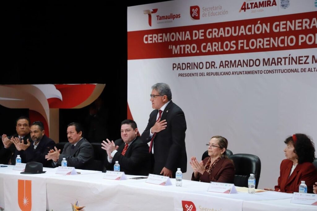 Altamira, Tamaulipas.- Fiel a su convicción de que “sin educación no hay transformación”, el presidente municipal, Dr. Armando Martínez Manríquez asistió a la ceremonia de graduación de una nueva generación de futuros ingenieros de la Universidad Politécnica de Altamira, acto llevado a cabo en el Teatro Metropolitano del vecino municipio de Tampico.