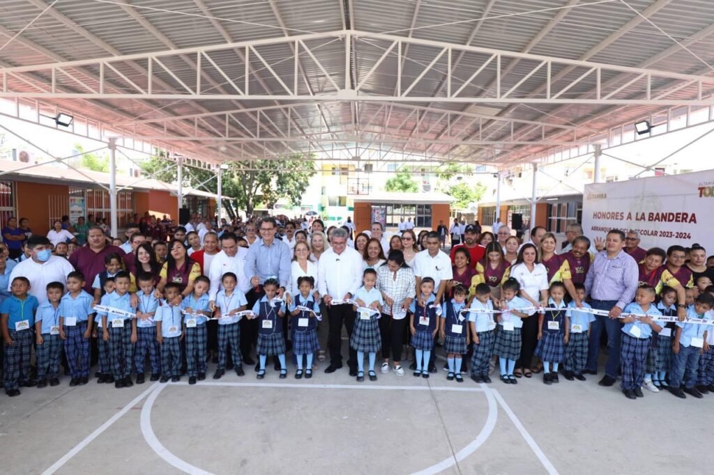 Altamira, Tamaulipas.- En un significativo gesto en el marco del inicio del nuevo ciclo escolar, el presidente municipal de Altamira, Dr. Armando Martínez Manríquez, realizó una visita a la escuela primaria “Prisciliano Peraza Chagoya”, ubicada en el Sector Los Mangos. Durante esta visita, se llevó a cabo la entrega de útiles escolares y mochilas a los estudiantes, junto con la inauguración de una moderna techumbre que proporcionará un espacio versátil y seguro para las actividades deportivas, culturales y educativas de los alumnos.