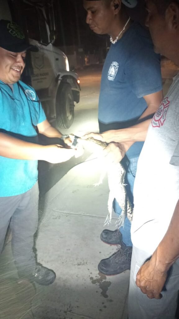 El segundo reporte fue a las 00:36 horas de este jueves, donde señalaba que un cocodrilo de aproximadamente metro y medio de largo, se encontraba en un escalón del acceso a un gimnasio ubicado en la calle 13 entre 35 y 36 de la colonia Heriberto Kehoe, por lo que fue capturado por bomberos Madero.