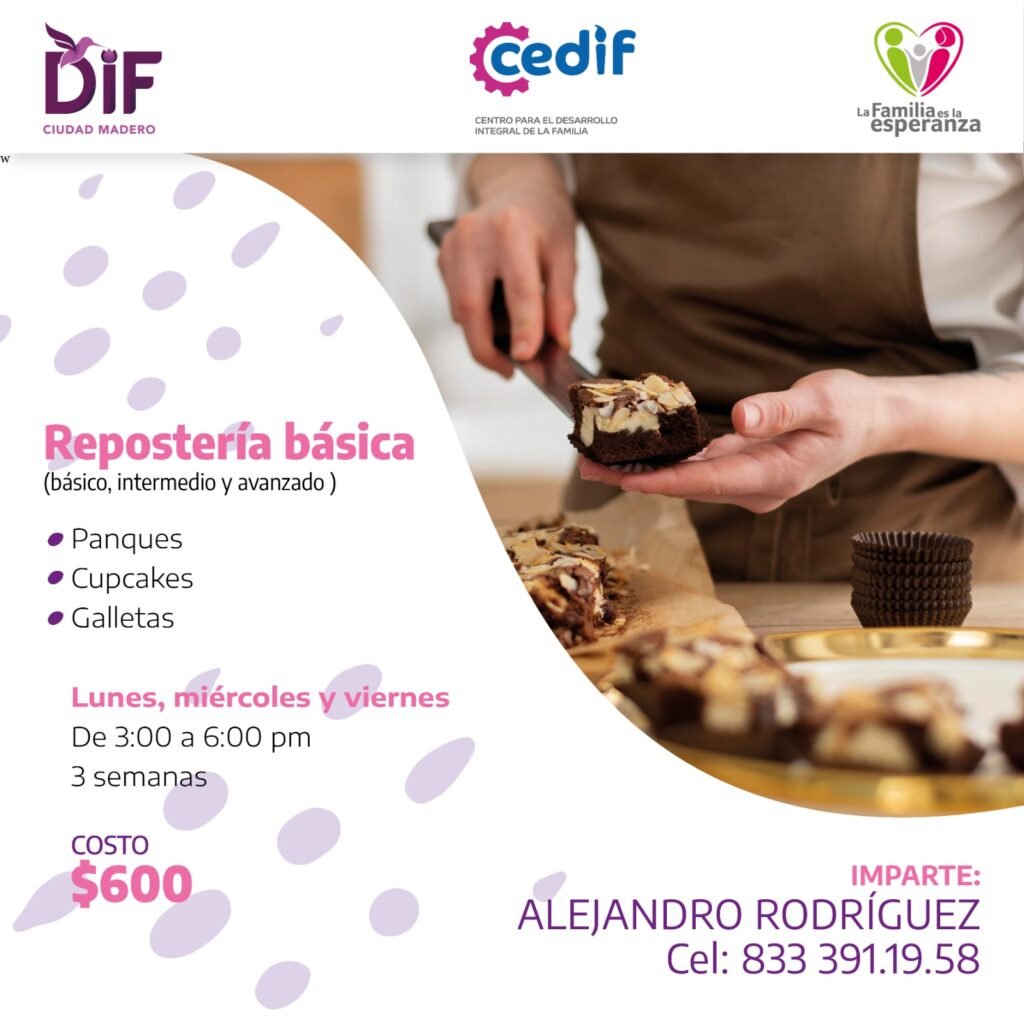 Informó la directora del DIF Madero, que los interesados en asistir a estos cursos pueden comunicarse a los teléfonos 833-266-63-78, 833-299-44-77(Belleza) y 833-391-19-58 (Repostería).