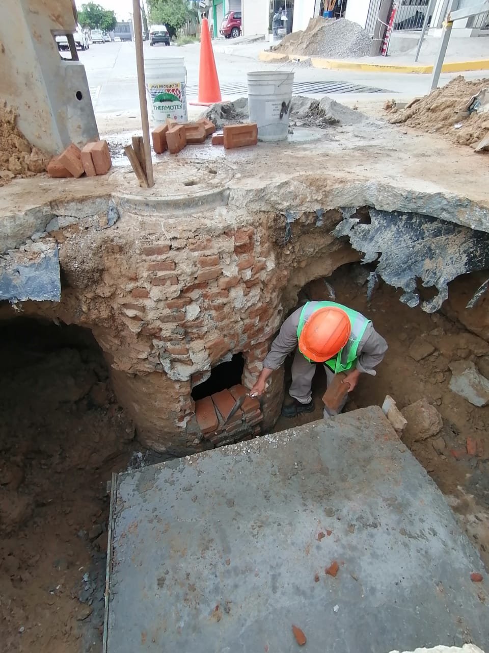 Se trata de la reparación de una línea general de 12 pulgadas de diámetro de ADS, una línea de presión de 36” de conducción de aguas negras y trabajos de rehabilitación de un pozo de visita colapsado, lo que ocasionaba el desborde de aguas negras en diversas calles.