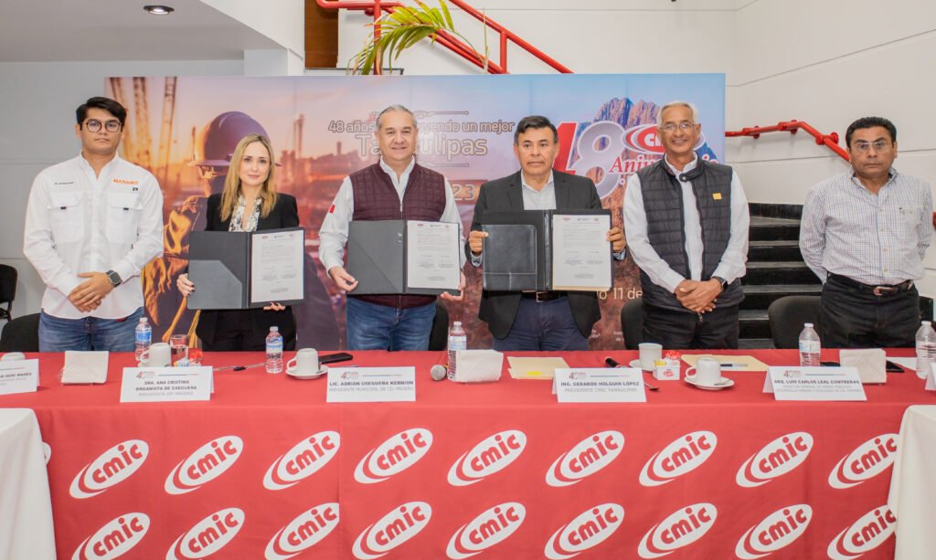 Fue en la mañana de este martes, en las instalaciones de la CMIC, donde el Presidente Municipal, acompañado por su esposa, Sra. Ana Cristina Organista de Oseguera y el Ing. Gerardo Holguín Lopez, presidente CMIC Tamaulipas, realizaron la firma de dicho acuerdo que aumentará el beneficio para seguir coordinando acciones de desarrollo en la urbe petrolera.