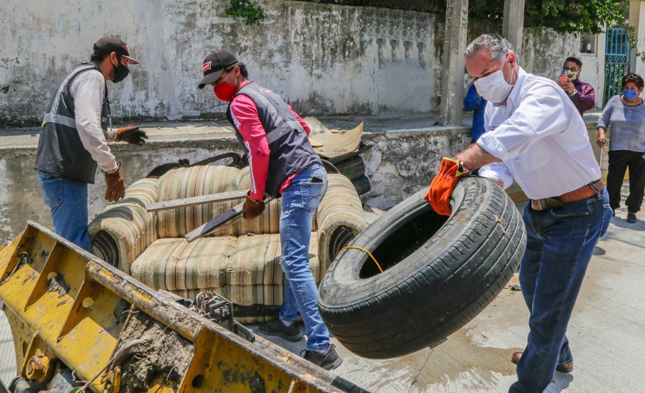 Durante su recorrido por la colonia Miramar 1, el Presidente Municipal encabezó estas acciones de descacharrización llevadas a cabo por personal de la Dirección de Municipio Saludable.