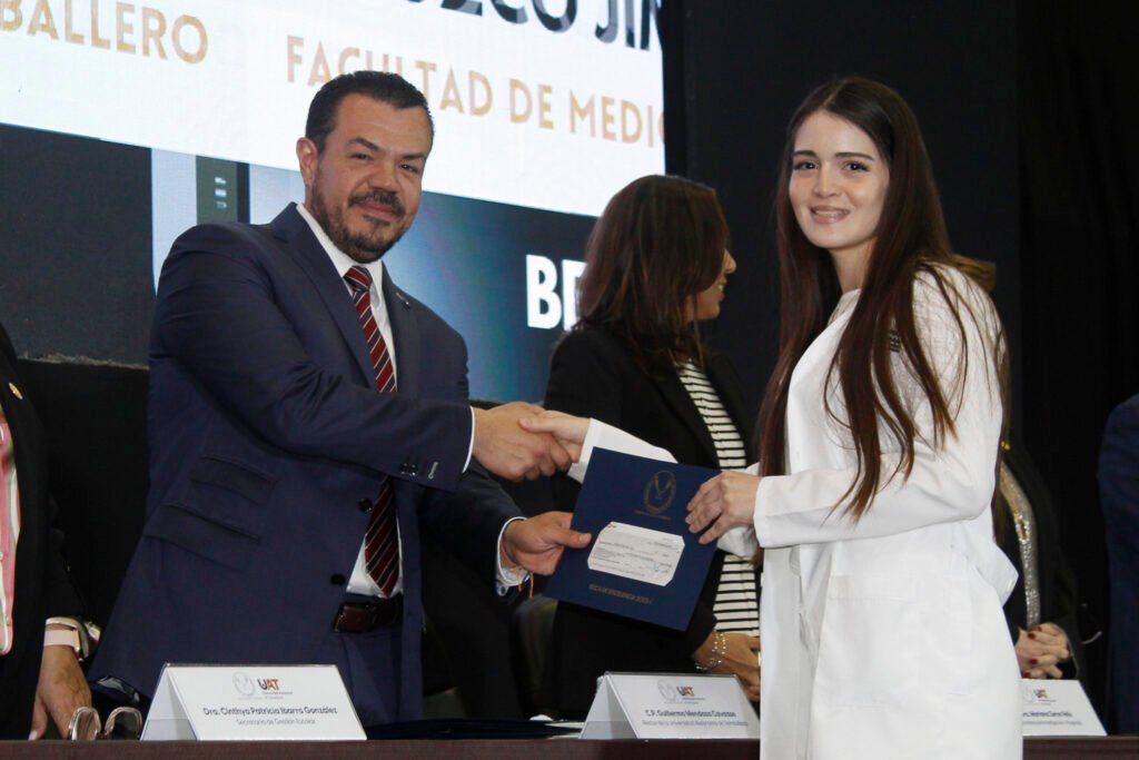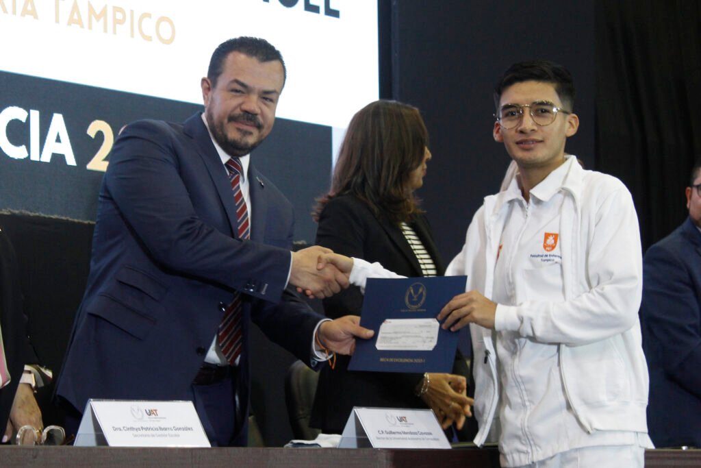 Acompañado por la Dra. Cinthya Patricia Ibarra González, secretaria de Gestión Escolar de la UAT, el C.P. Guillermo Mendoza felicitó al alumnado por el esfuerzo sobresaliente que les ha permitido recibir esta distinción.