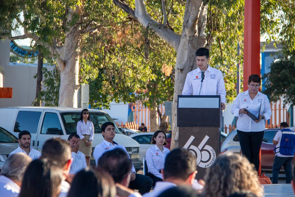 De igual manera, participaron: el Lic. Janitzio Uriel Salazar Marín, alumno de la Maestría en Ciencias en Orientación de Trabajo Social, quien dirigió la entonación del himno nacional; del alumno de la carrera de Psicología, Jesús Gabriel Puga Hernández, que hizo el juramento a la bandera; en tanto que la lectura de las efemérides y fechas importantes nacionales y estatales estuvo a cargo de Kkrytzell Amairani Quevedo Saucedo y Jorge Martínez Perales, estudiantes de las licenciaturas de Psicología y Nutrición, respectivamente.