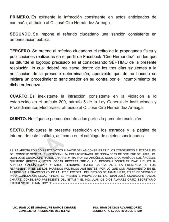 En un resolutivo de 55 páginas, el Instituto Electoral de Tamaulipas da a conocer que se presentó suficiente material probatorio, por lo que se determinó mediante votación en sesión extraordinaria este jueves 22 de octubre, que sí existe la infracción consistente en actos anticipados de campaña, por lo que resuelve una sanción consistente en una amonestación pública.