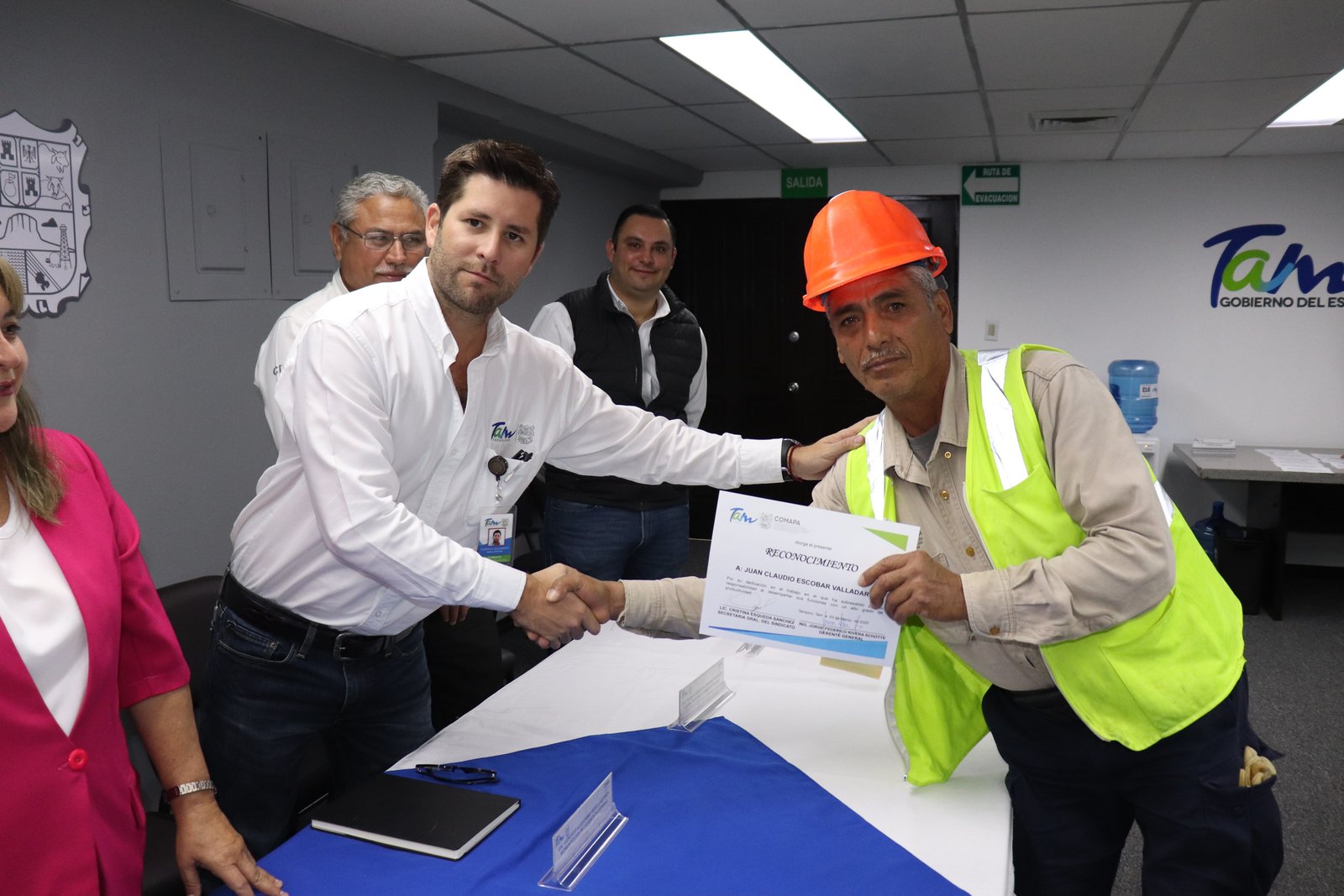 También estuvieron presentes en el evento Cristina Esqueda Sánchez, Secretaria General del Sindicato de COMAPA; Miguel Pérez Álvarez, Gerente Comercial; Santiago Treviño Luévano, E.D. de la Gerencia Administrativa; Mario Alberto Palomares Morales, E.D. de la Gerencia Técnica y Juan Manuel Palomino Maldonado, E.D. de la Coordinación de Recursos Humanos.